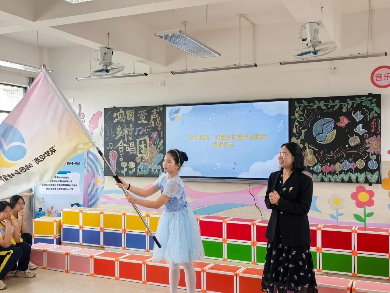 2025年12月24日,“筑梦蚬岗,唱响希望”鸿图乡村童声合唱团成立仪式在肇庆市高要区蚬岗镇中心小学举行。共青团肇庆市委员会书记黄屹娴为合唱团授旗,鸿图科技青年代表出席仪式,共同见证乡村美育新阵地的诞生。