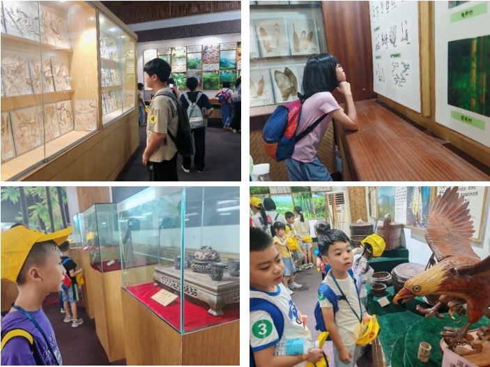 广宁竹文化博览馆内设有竹产品展示大厅、竹箸馆、竹雕精品馆、竹书馆、竹标本馆、竹文房用具馆六大主题分馆。展览体系完整、内容丰富,涵盖了竹的生物特性、历史渊源、工艺传承、文化艺术、生活应用诸多方面。活动当日上午,孩子们一踏入竹文化博览馆,便被扑面而来的竹香和深邃的文化氛围所吸引。在讲解员的引导下,他们穿行于各馆之间,通过不同主题的展馆和竹艺作品,直观感知“竹全身是宝”的生态价值与文化意义,进一步理解了竹资源在地方经济发展和传统工艺延续中发挥的重要作用。